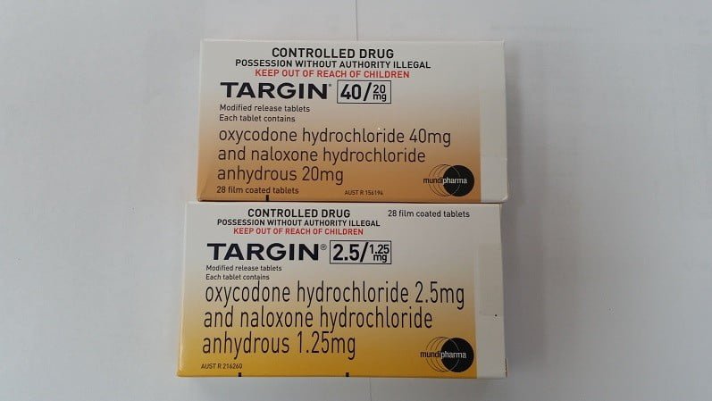 Oxycodone/naloxone, sold under the brand name Targin among others, is a combination pain medication available as modified-release tablets administered by mouth.[5]